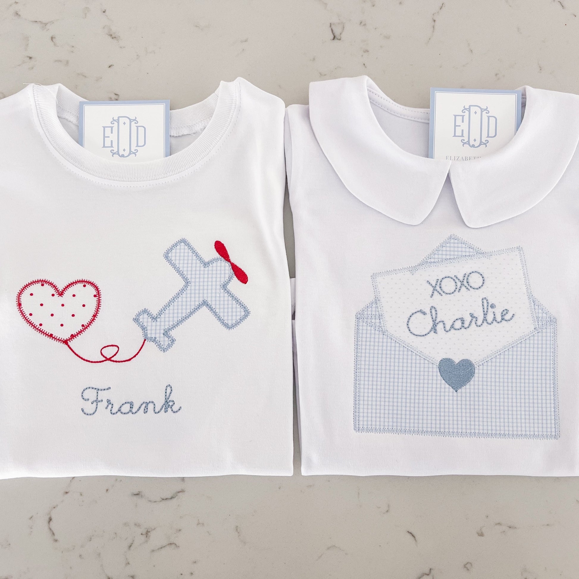 “Boys Airplane” will come lIke pictured - in blue windowpane airplane, red bitty dot heart.