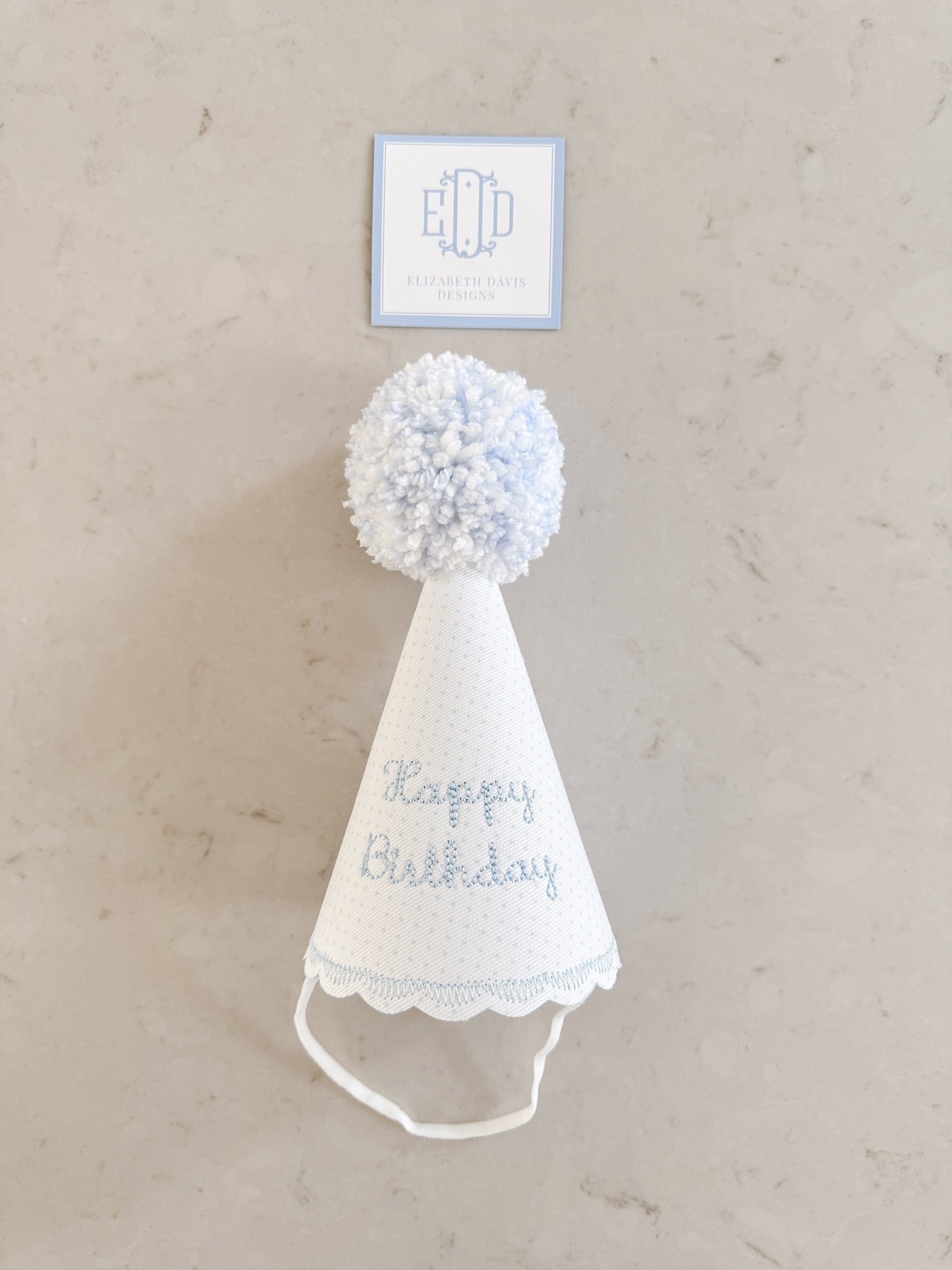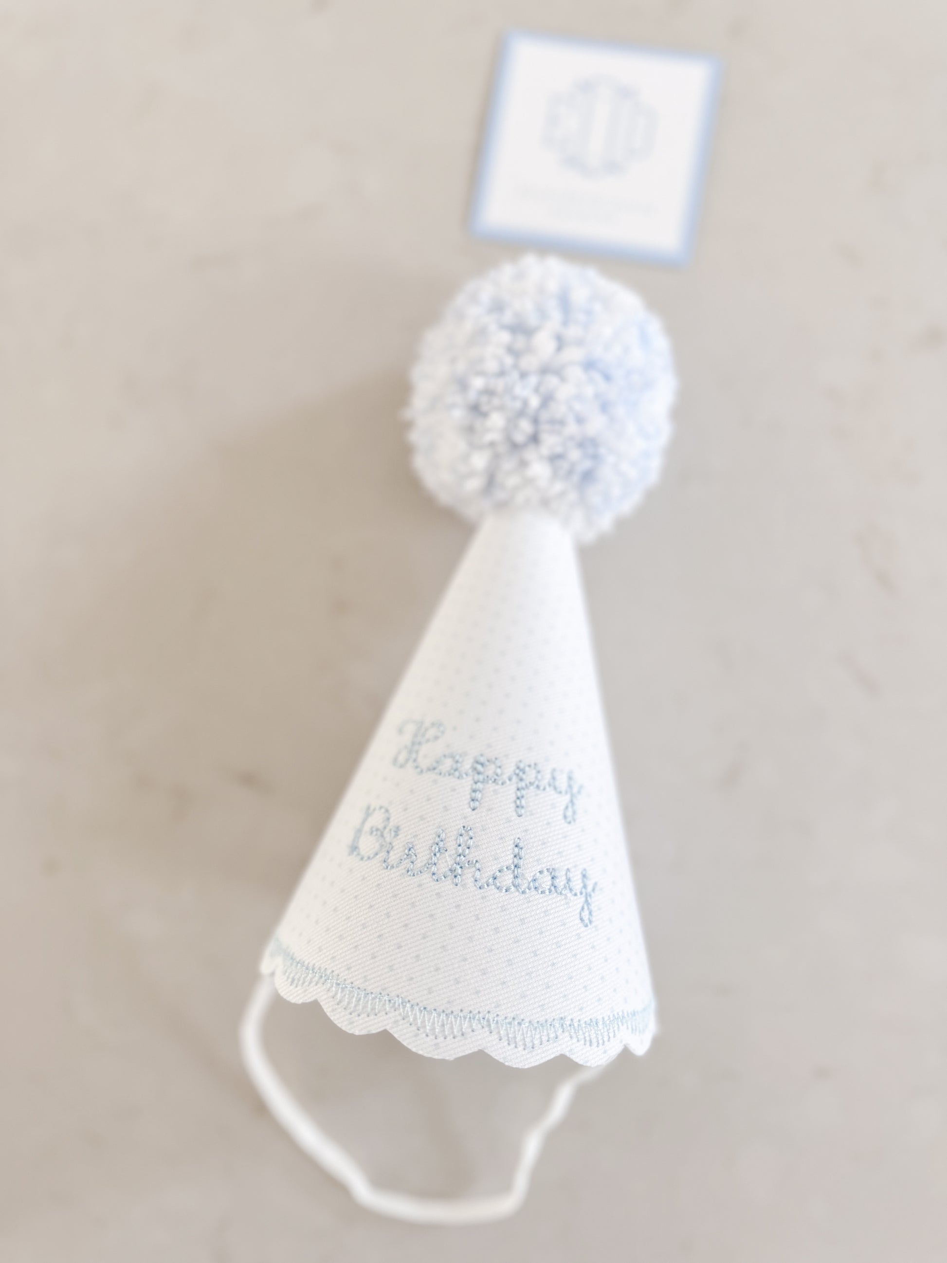 Blue bitty dot party hat with "Happy Birthday" embroidered in baby blue. Light blue and white pompom.