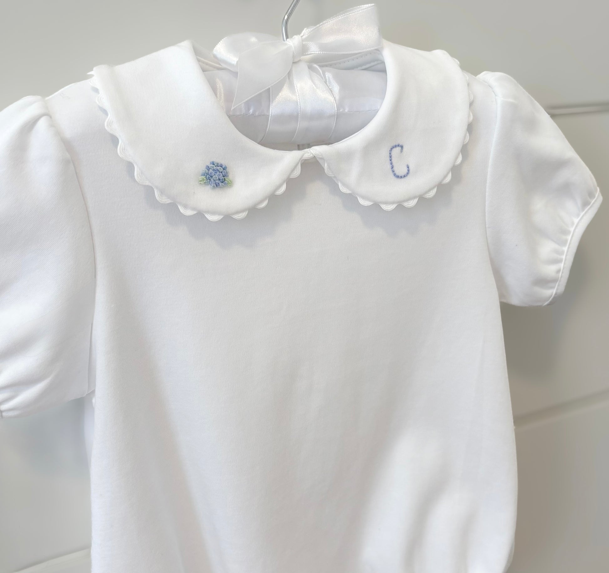 Our sweet ric rac bubbles and girls shirts are even sweeter with a hand stitched hydrangea and initial on the collar! These make the perfect matching set for sisters and are so darling to wear all summer and into the fall!