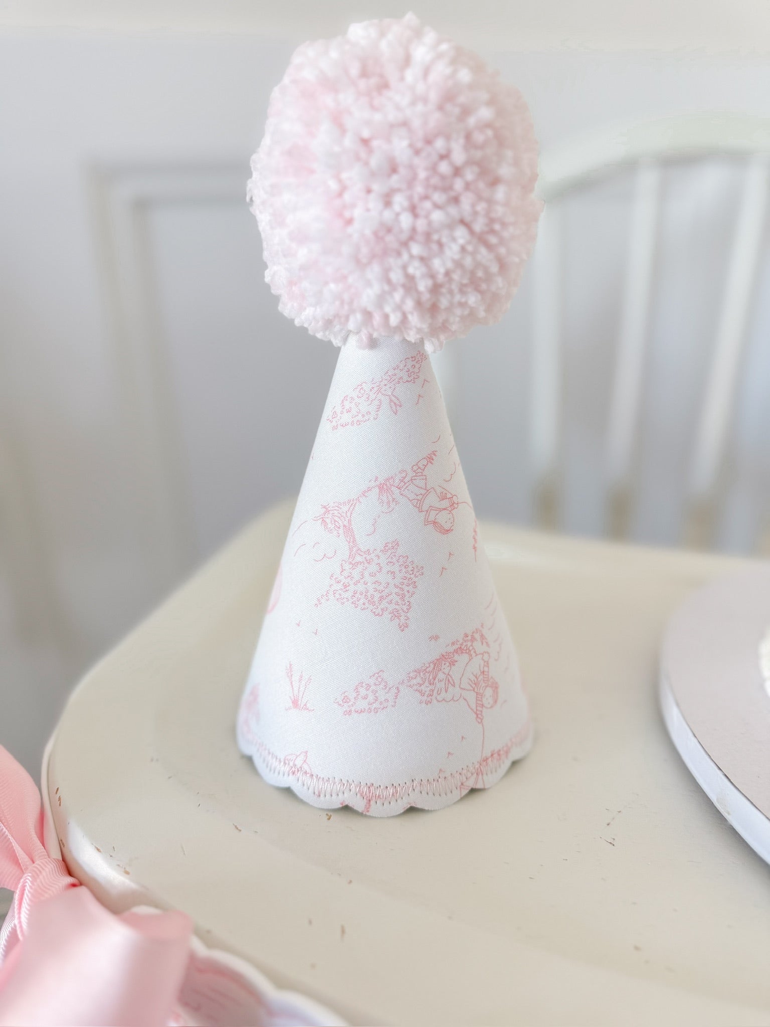 This beautiful party suite is made with the sweetest playful pink toile fabric that will be darling & timeless for your little one’s first birthday in such a classic color scheme!