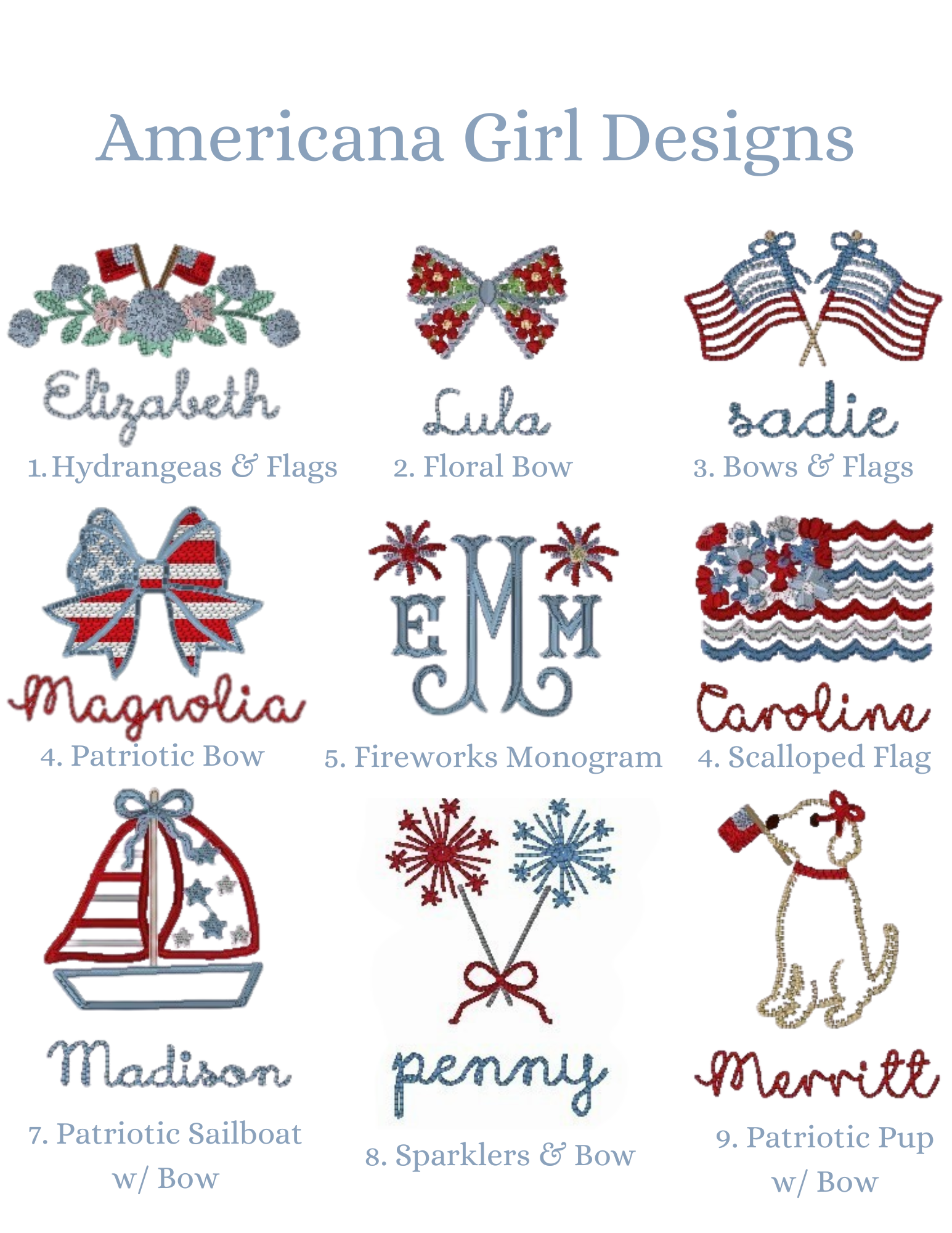 Precious baby girl bibs in either classic white, ruffle trim white, red ric rac trim, blue ric rac trim, pink ric rac trim, white ric rac trim, white picot trim, light blue picot trim, or pink picot trim with one of our darling Summer and Americana designs! Just choose your design, bib type (and trim color if applicable) and add your child's name below!