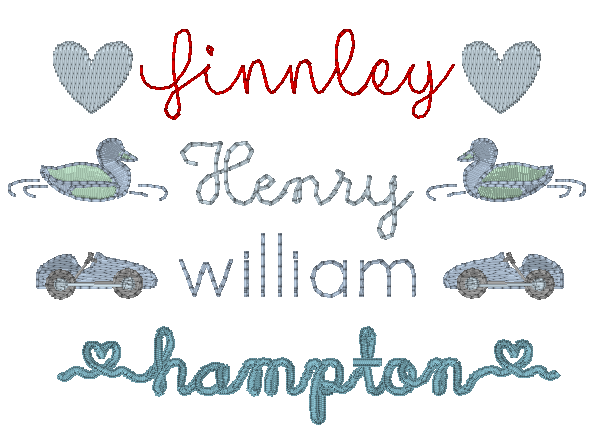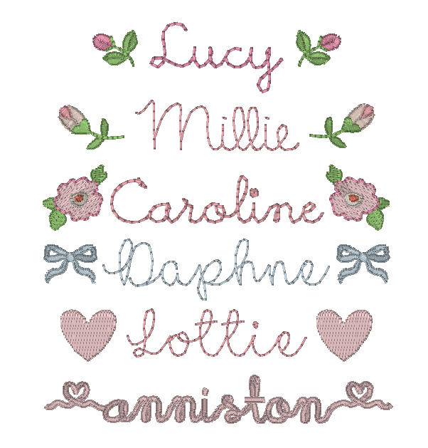 Personalize with their name and a tiny Valentines design. All designs are stitched in the colors as pictured.