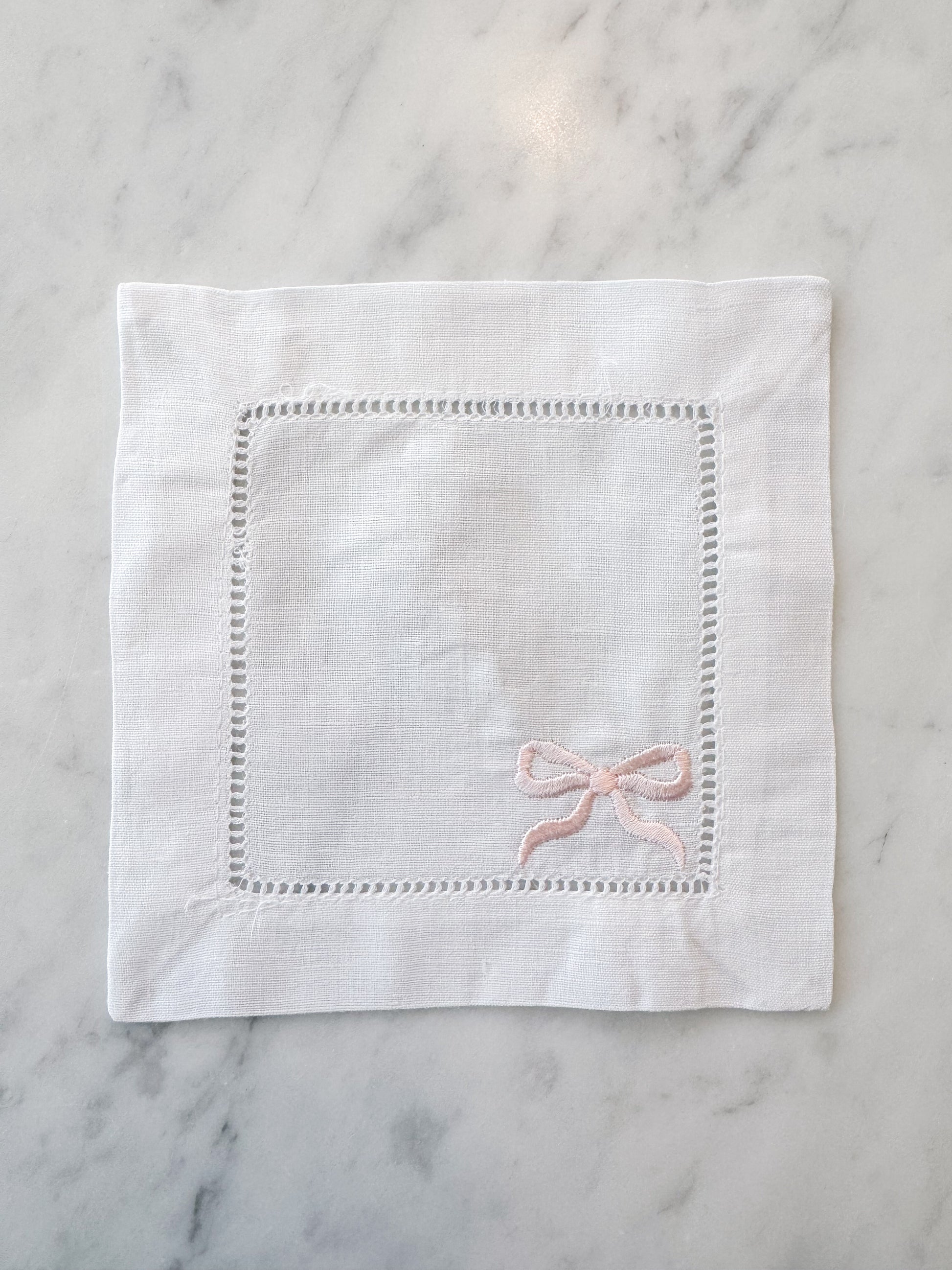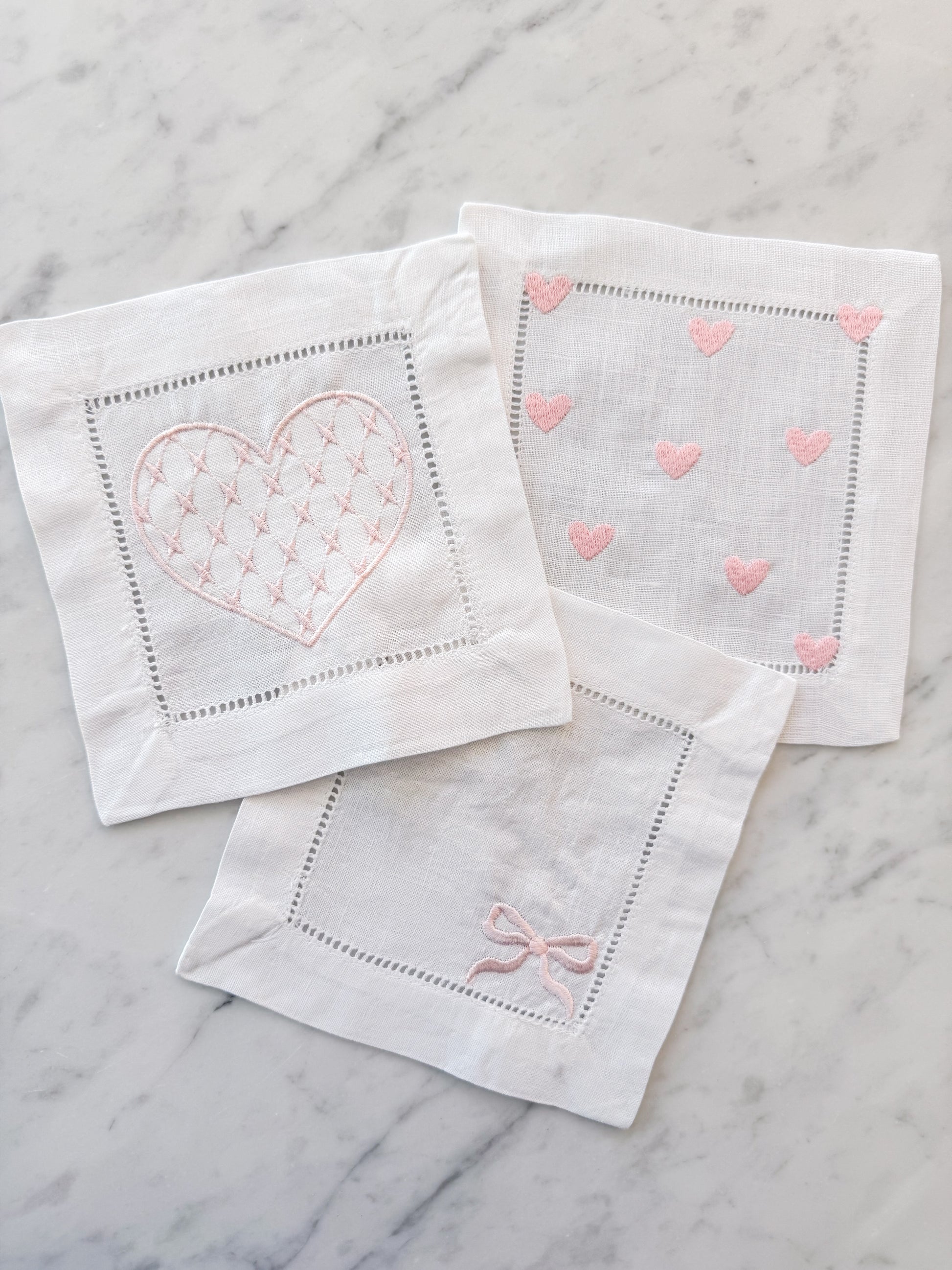 White cocktail napkins - will be stitched in a beautiful baby pink thread for a soft & sweet look, with still enough visible contrast to be seen nicely!