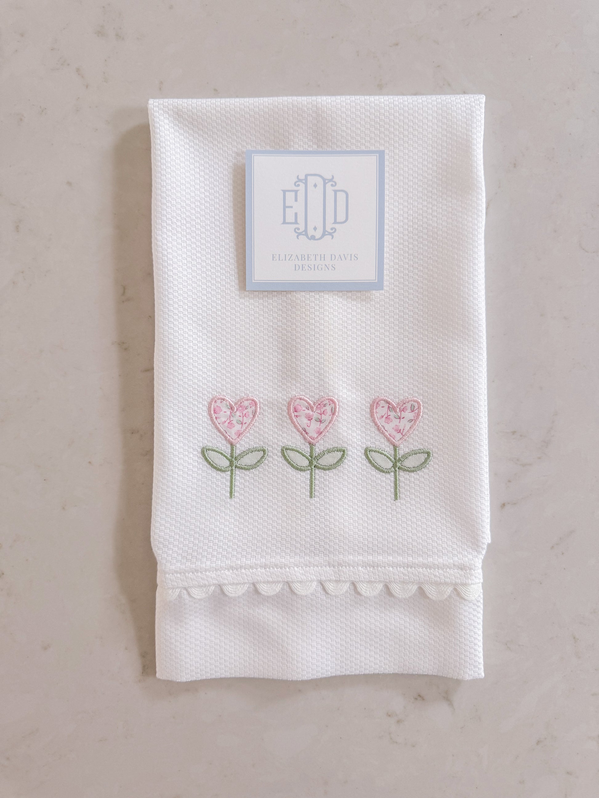 Our luxe pique cotton guest towel with scalloped trim is the perfect festive detail to make sure even your powder room feels the love! The adorable floral fabric applique heart flowers are such a sweet touch.